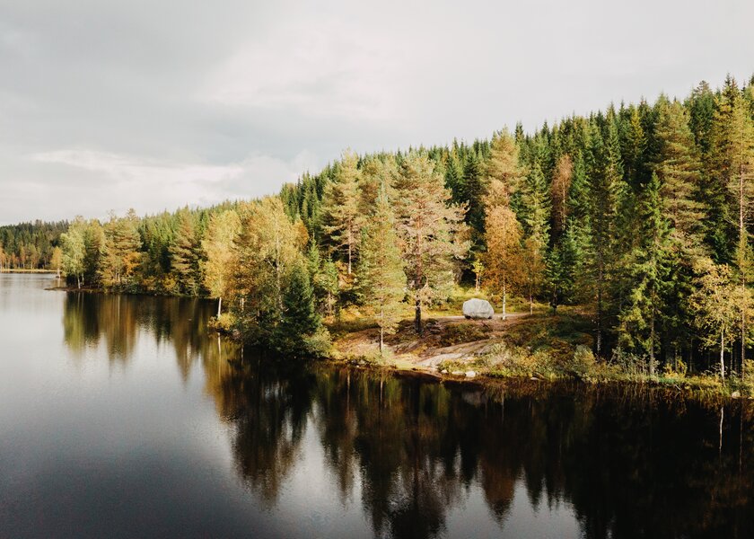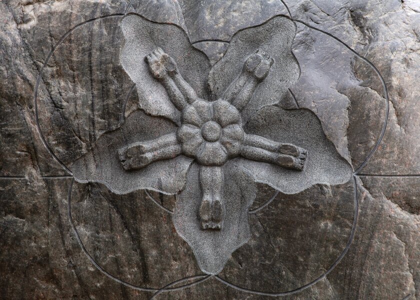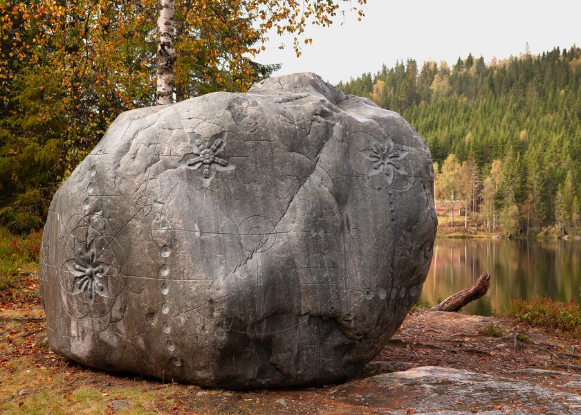 «Skogene blomstrer» er en stor kampestein som er dekket av relieffer med motiv fra abstraksjoner av vann og lys, og de tre blomstene skogstjerne, Olavstake og tyttebærblomst.